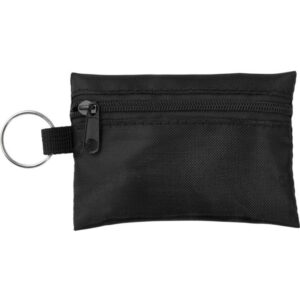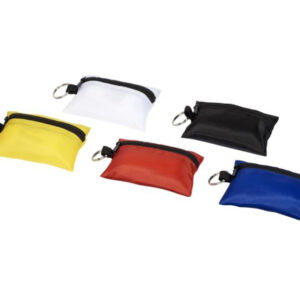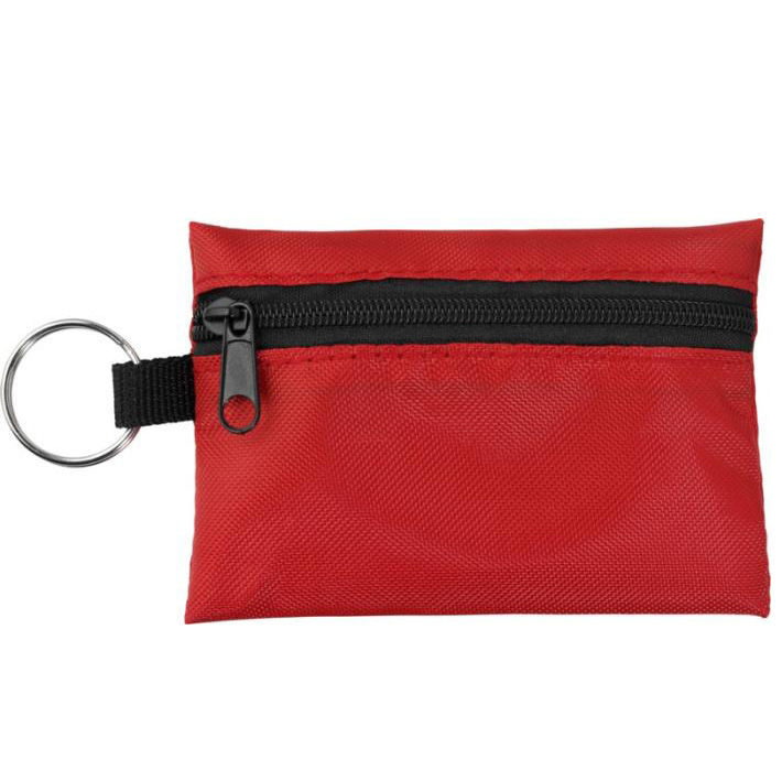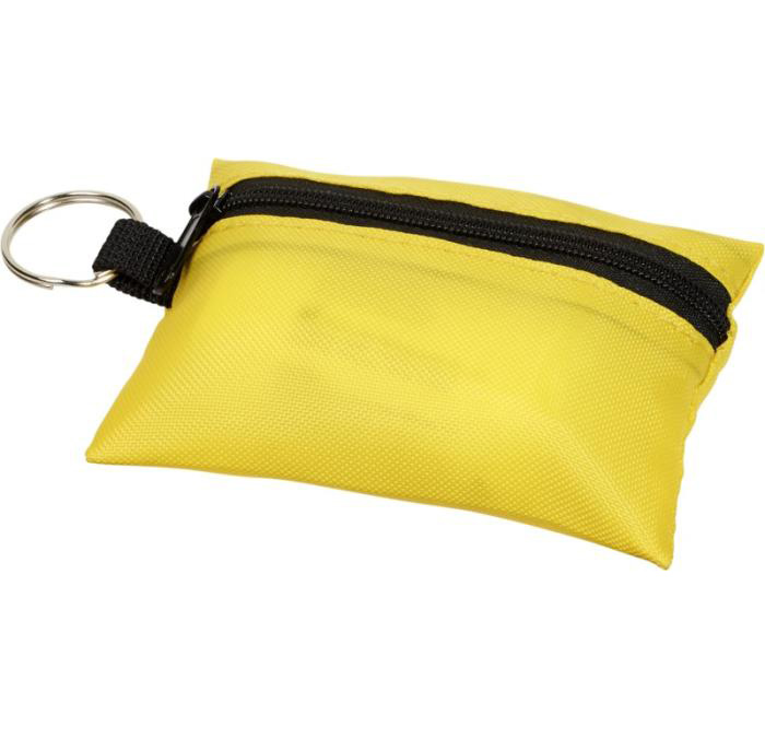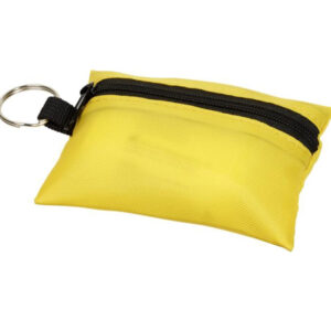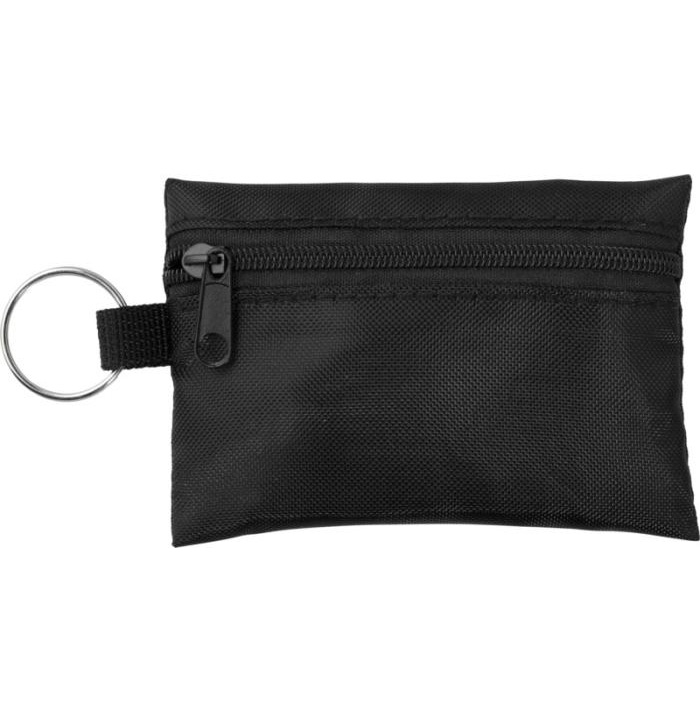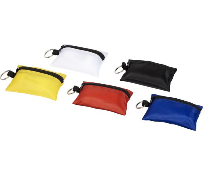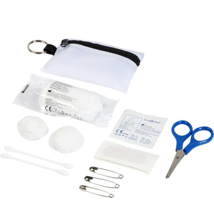 Kätevä polyesteripussi avaimenperällä sisältää 16 ensiaputarviketta. Pakkauksessa sakset (9 cm), 2 ihon puhdistuspyyhettä, 1 joustava side (4 m x 6 cm), 2 pumpulityynyä (0.5g), 3 hakaneulaa (3.6 cm), 5 laastaria (45×19 mm) ja 2 pumpulipuikkoa (8 cm). Sopii hienosti matkoille, festivaaleihin, tapahtumiin ja muuhun ulkoiluun. Pussissa on suuri logomerkintäalue. Ensiapupakkausta pidetään lääkinnällisenä laitteena, ja se on 93/42/EEC-asetuksen alainen.
