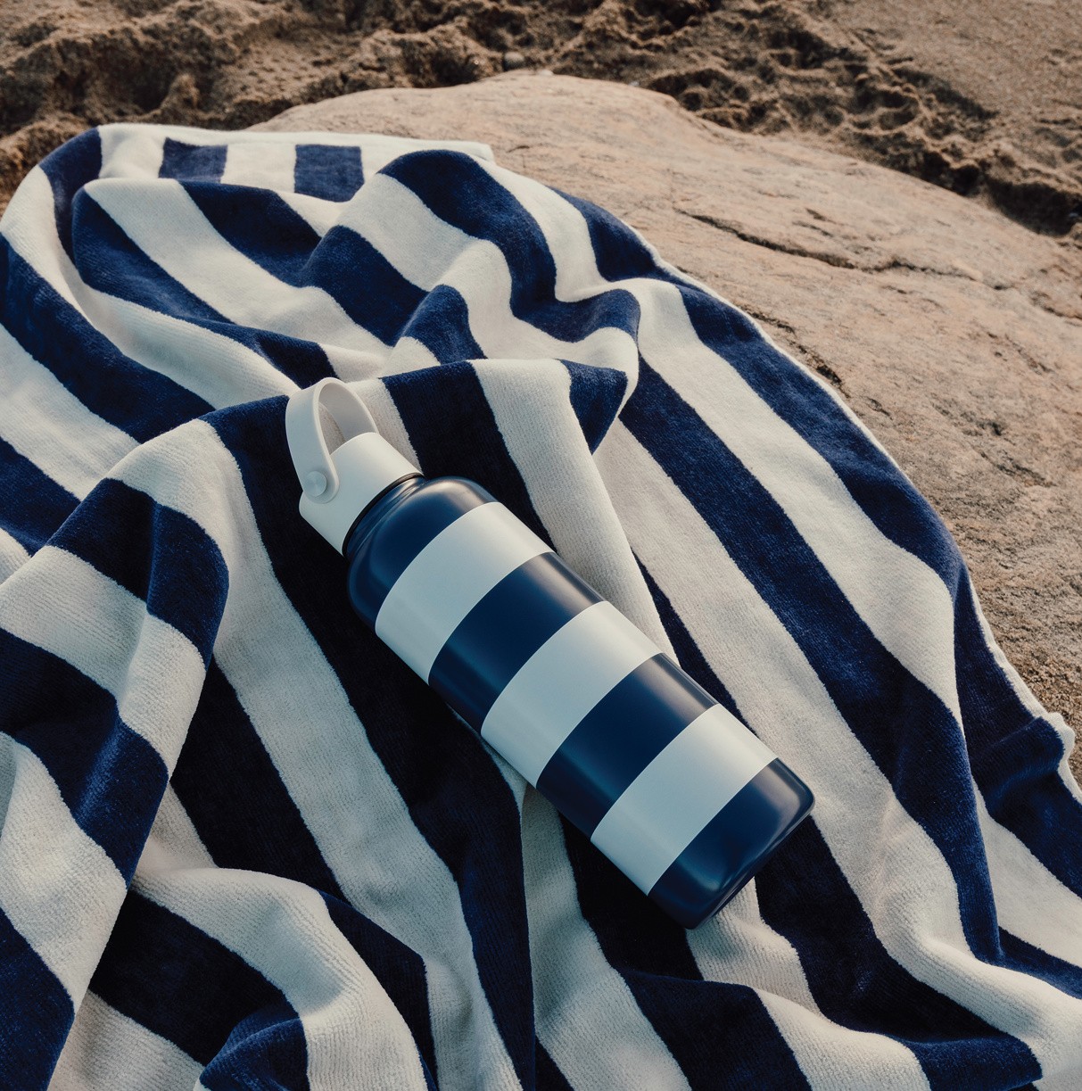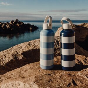 Pullossa on klassinen kaksivärinen raidallinen kuvio ja tyylikäs valkoinen silikoninen kantokahva. Kaksoiseristys pitää juomat kylminä jopa 12 tuntia ja kuumina jopa 6 tuntia – täydellinen valinta niin viilentävälle juomalle kuin lämpimälle juomalle liikkeellä ollessasi.
