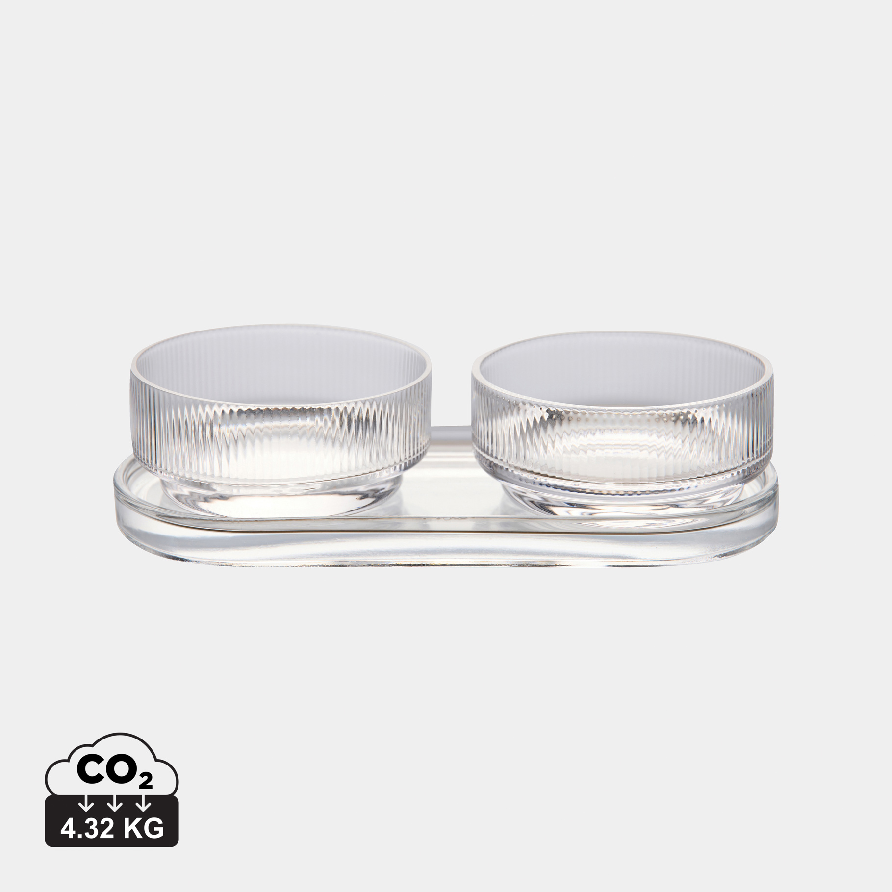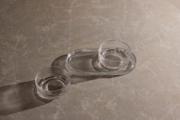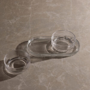 Settiin kuuluu kaksi kulhoa ja tarjotin, joita voi käyttää yhdessä tai erikseen. Valmistettu sooda-kalkkilasista.