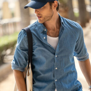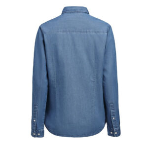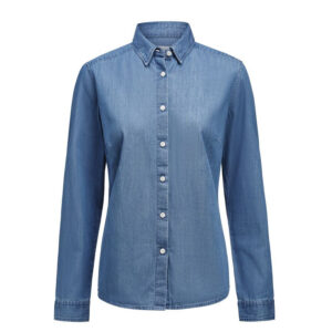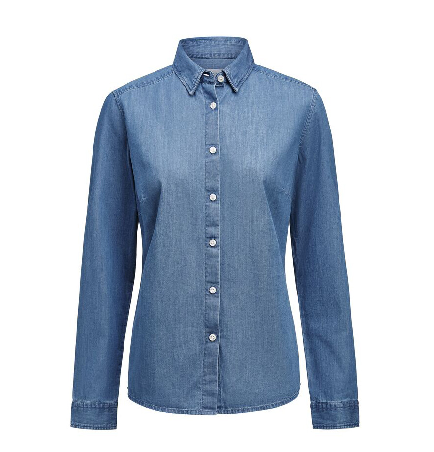 Piilonapillinen kaulus ja helmenvalkoiset napit luovat klassisen farkkupaidan ilmeen. Miesten malli on saatavilla Tailored Fit -mitoituksella, ja naisten malli Contemporary Fit -mitoituksella.