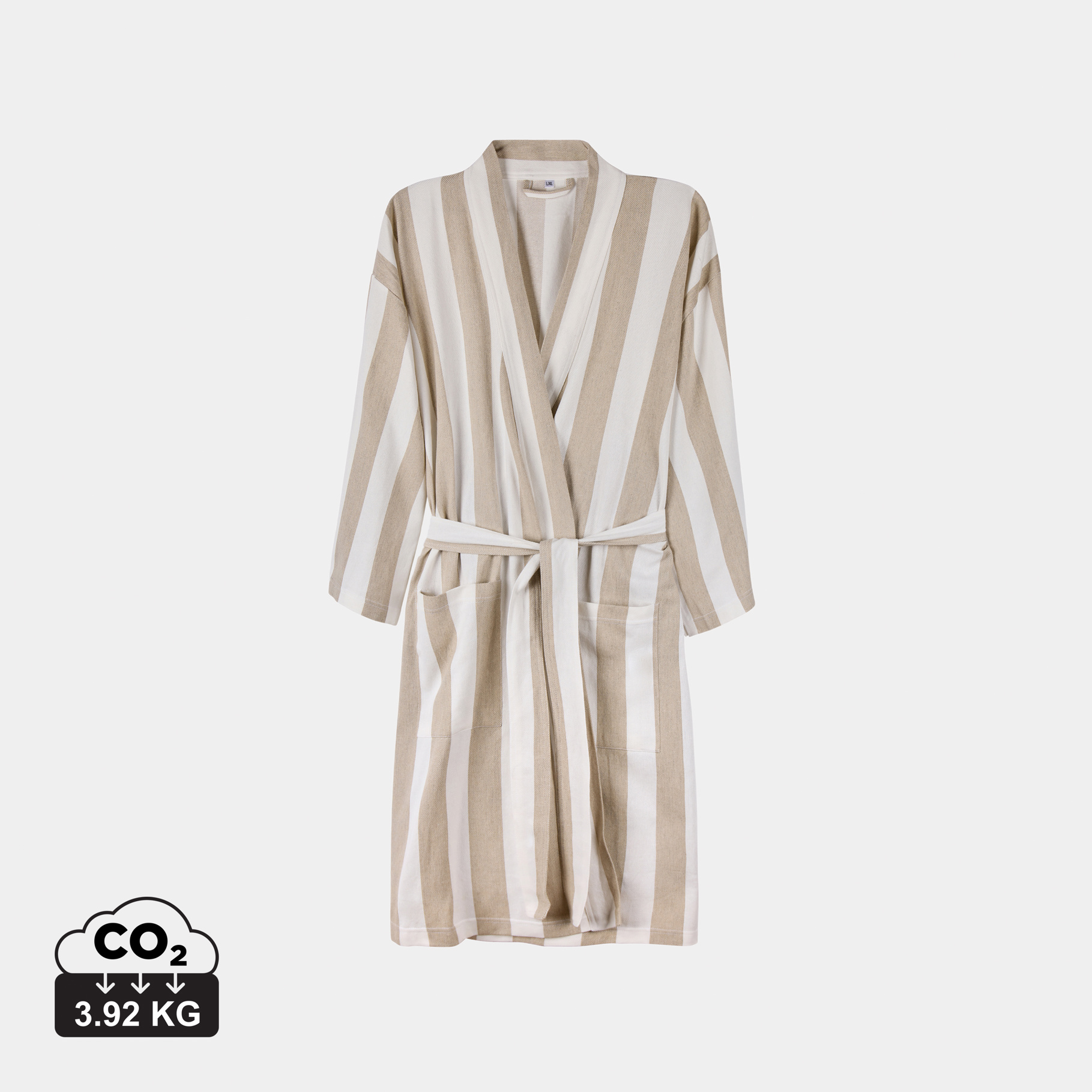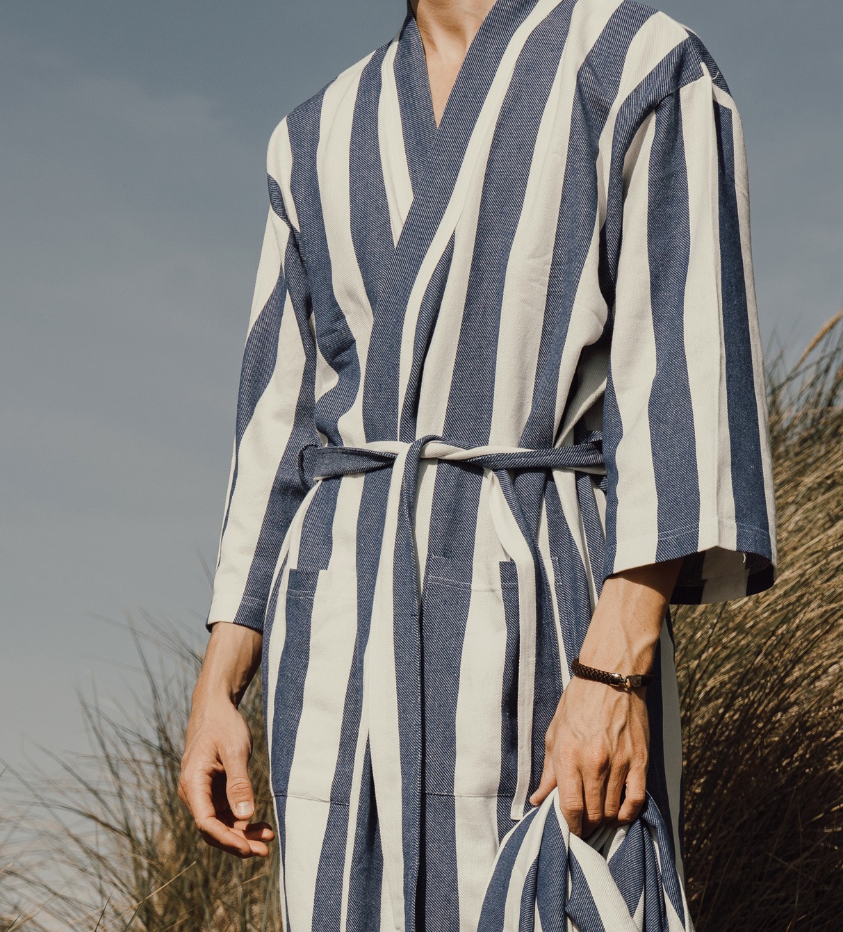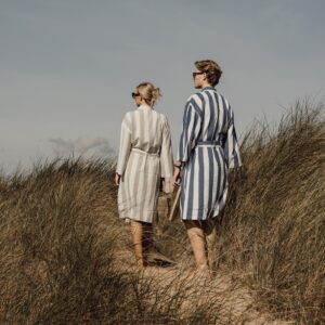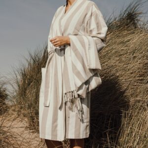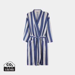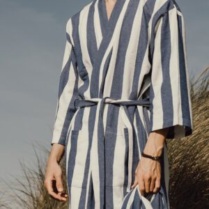 Tyyliltään klassisessa kylpytakissa on kaksivärinen raitakuviointi, siisti kaulus, etutaskut, 3/4-pituiset hihat ja vyö vyötäisillä täydellisen istuvuuden varmistamiseksi.